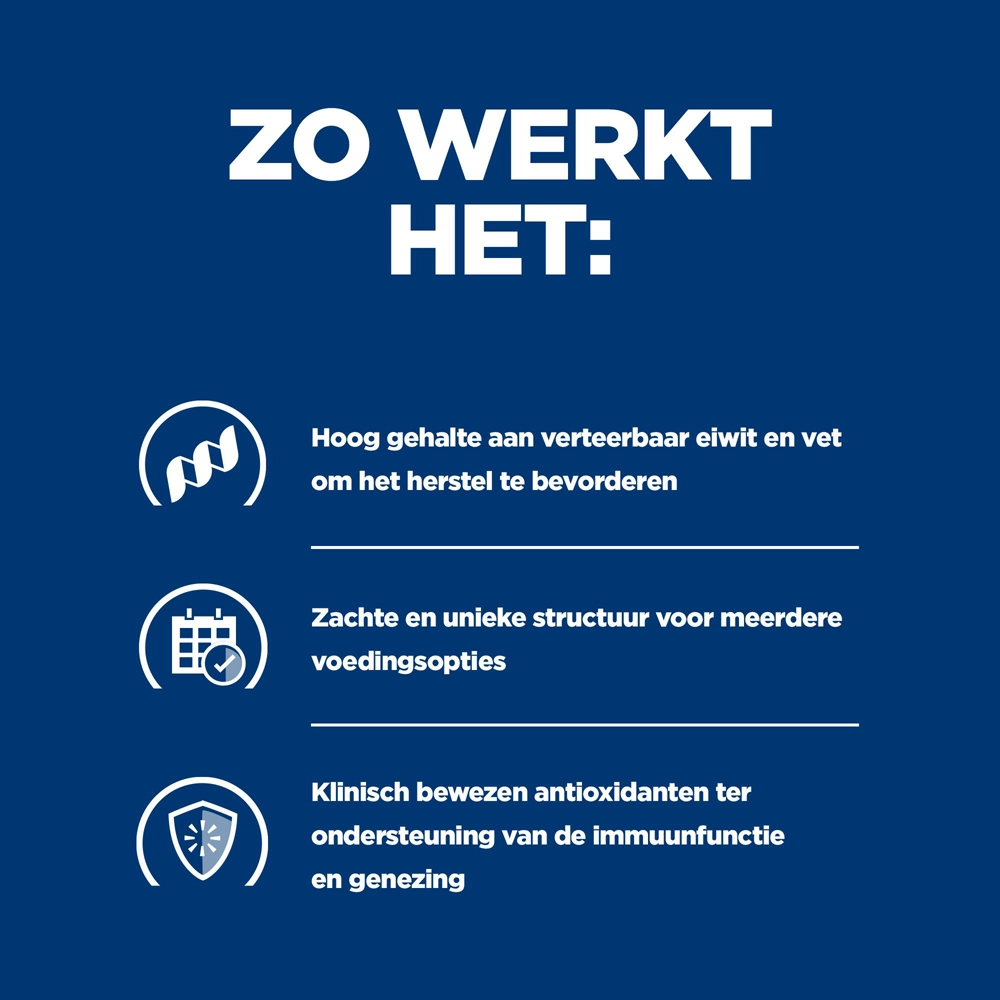 Een volledig dieetvoeder voor honden en katten voor het nutritioneel herstel (convalescentie) en hepatische lipidose bij katten. Dit voeder heeft een hoog energiegehalte, een hoog gehalte aan essentiële voedingsstoffen en goed verteerbare ingrediënten.