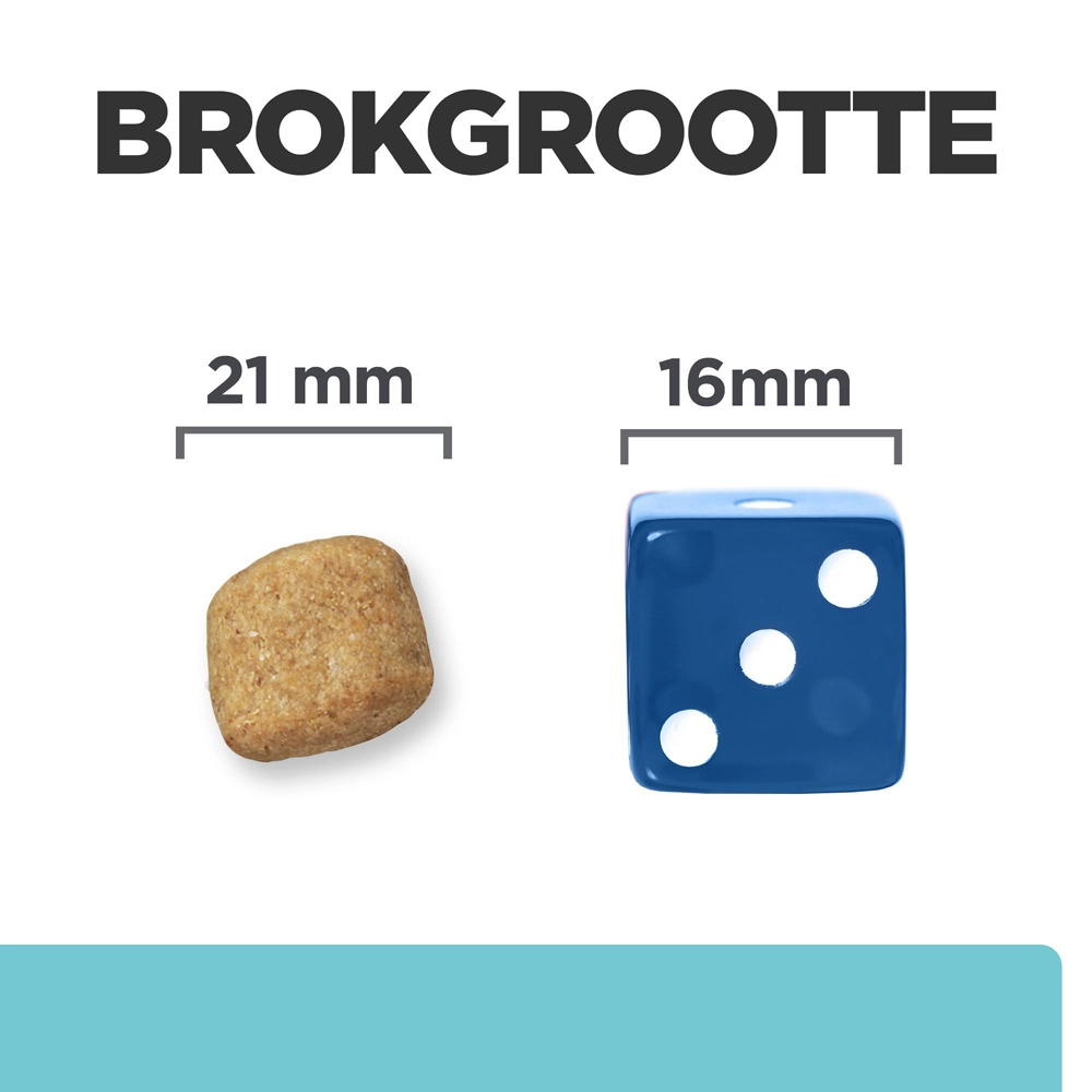 De brokjes bevatten klinisch bewezen triple action vezelmatrixtechnologie om tandplak, tandverkleuring en tandsteen te verwijderen. De speciale matrix van vezels schrobt de tand om tandplak te verwijderen, wat de adem helpt opfrissen. De grote brokgrootte, vorm en textuur reinigt de tanden tot aan de tandvleesrand om gezond tandvlees en tanden te bevorderen. Het is aangetoond dat het exclusief voeren van Hill’s Prescription Diet t/d droogvoer voor honden effectiever is dan tandenpoetsen, omdat slechts een paar hondenbezitters de tanden van hun hond regelmatig poetsen. Hill’s voedingsdeskundigen en dierenartsen hebben Prescription Diet t/d klinische voeding ontwikkeld om gezond tandvlees en tanden te bevorderen en de algehele gezondheid van je hond te ondersteunen.