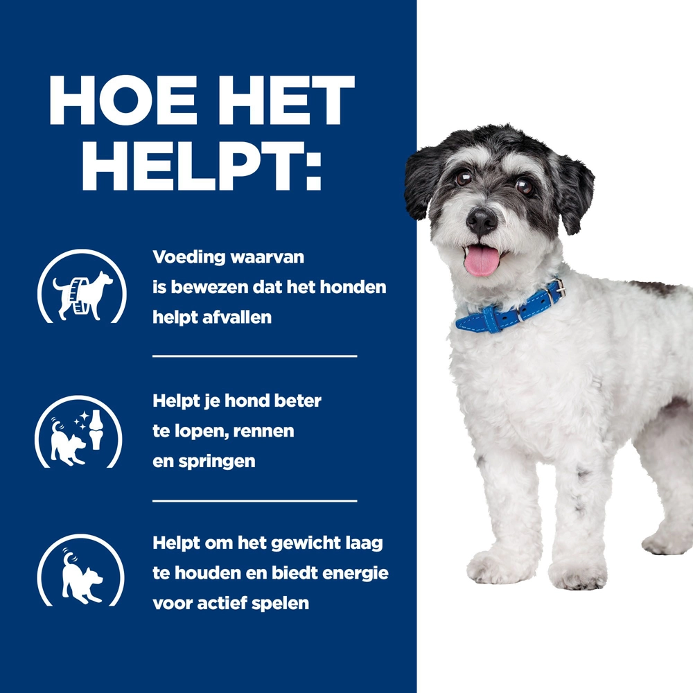 Hill’s voedingsdeskundigen en dierenartsen hebben Prescription Diet Metabolic + Mobility Mini dieetvoeding voor huisdieren ontwikkeld, speciaal samengesteld om het gewichtsbeheer en de gewrichtsgezondheid van je huisdier te ondersteunen. Werkt natuurlijk met het unieke energieverbruik van je hond voor gemakkelijk en effectief gewichtsverlies en kan langdurig worden gebruikt. In feite is Prescription Diet Metabolic + Mobility Mini klinisch bewezen voeding om honden te helpen op natuurlijke wijze gewicht te verliezen en de mobiliteit te verbeteren in slechts 21 dagen. Dit droogvoer heeft een onweerstaanbare kipsmaak waar je hond dol op zal zijn.