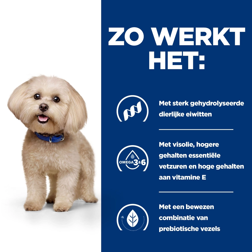 Voedselovergevoeligheden ontstaan doordat eiwitten de huid binnendringen en via het spijsverteringsstelsel door het lichaam gaan, waardoor het immuunsysteem reageert. z/d Mini is een gespecialiseerd voer met eiwitten die zacht zijn en in kleinere stukjes gebroken zijn om detectie door het immuunsysteem te helpen voorkomen. Het voer helpt je hond beter te eten en bevat prebiotica om een gezond evenwicht in het darmmicrobioom te creëren en vetzuren om een gezonde huid op te bouwen.
