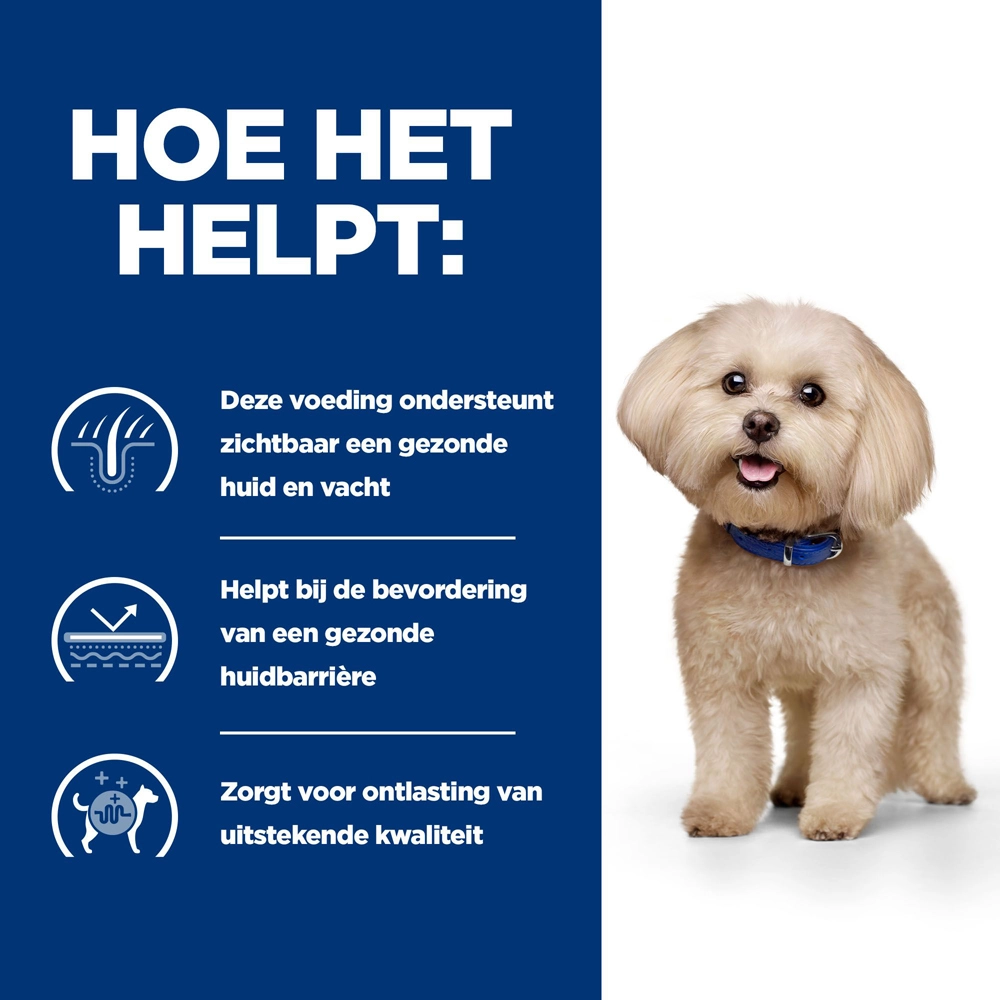Van z/d Mini is klinisch bewezen dat het de huid- en spijsverteringssymptomen van voedselintoleranties – wat jij dus ziet bij je hond – vermindert. Wees gerust, dit product werkt van binnenuit om de kern van het probleem aan te pakken: een overactieve reactie van het immuunsysteem op bepaald voer. Met voorbewerkte dierlijke eiwitten, antioxidanten, prebiotische vezels en huidvoedende voedingsstoffen.