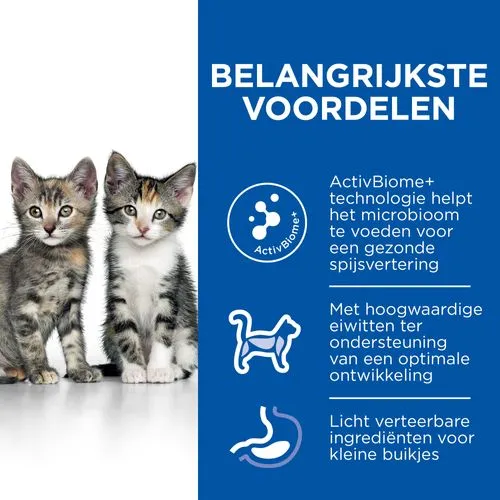Hill’s Science Plan Perfect Digestion Kittenvoer bevat ActivBiome+, Hill’s exclusieve mix van prebiotica om het specifieke microbioom van je kat te voeden en ze te helpen hun volledige potentieel te bereiken.